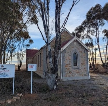 Lipson Uniting Church (first called Burrawing Mine Wesleyan Chapel) was the second church to be built on Eyre Peninsula in 1869 at the site of the Burrawing Copper Mines when they opened, has an interesting and colourful history. Services were conducted first in the Burrawing Mine carpenters shop and then at Mine School site. In 1873 a stone chapel was built with local stone 40 foot by 21 foot at the copper mine site. However when the copper rush ended 1874 the miners left the district, but despite this worship continued at Burrawing for the next 20 years!